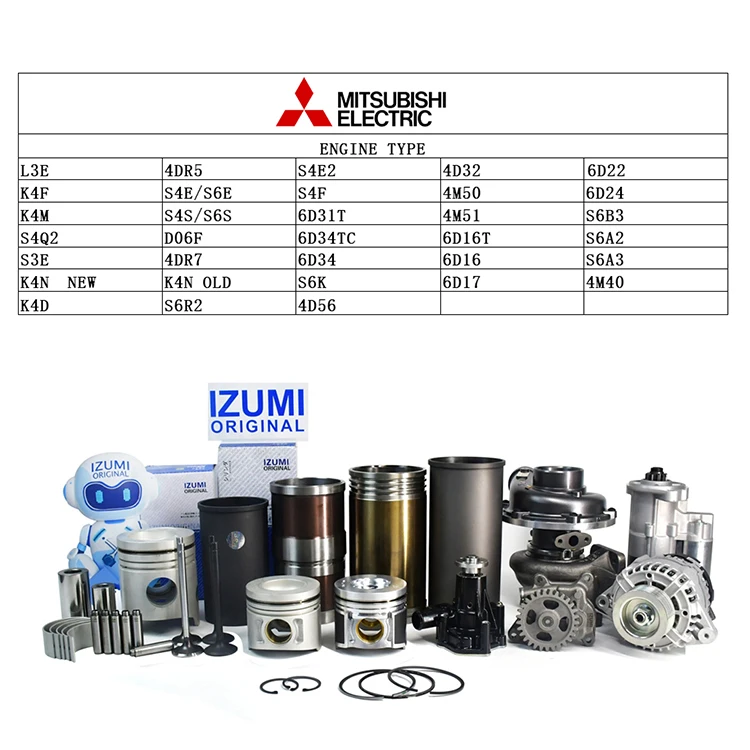 | FOR MITSUBISHI | 4D32 4D56 4D56T 4DR5 4DR7 4M40 4M40T 4M50 4M50T 4M51 4M51T 6D16 6D16T 6D17 6D22 6D24 6D31 6D31T 6D34 6D34TC K4D K4F K4M K4N L3E S3E S4E S4E2 S4Q2 S6E S4K S6K D06F S4F S4S S6S S6A2 S6A3 S6B3 S6R2 | |