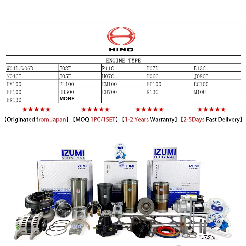 Profession Manufacturer and Wholesaler For Engine Spare PartsBrandIZUMI ORIGINALPlace Of OriginJAPANMOQ1PC/1 SETMODELProvide Complete Engine And Engine Parts Model FOR HINOIn Stock...